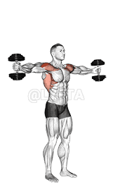 Extend your right arm straight down from your shoulder, then raise the dumbbell out to the side and up until it's at shoulder level, keeping your arm slightly bent at the elbow.